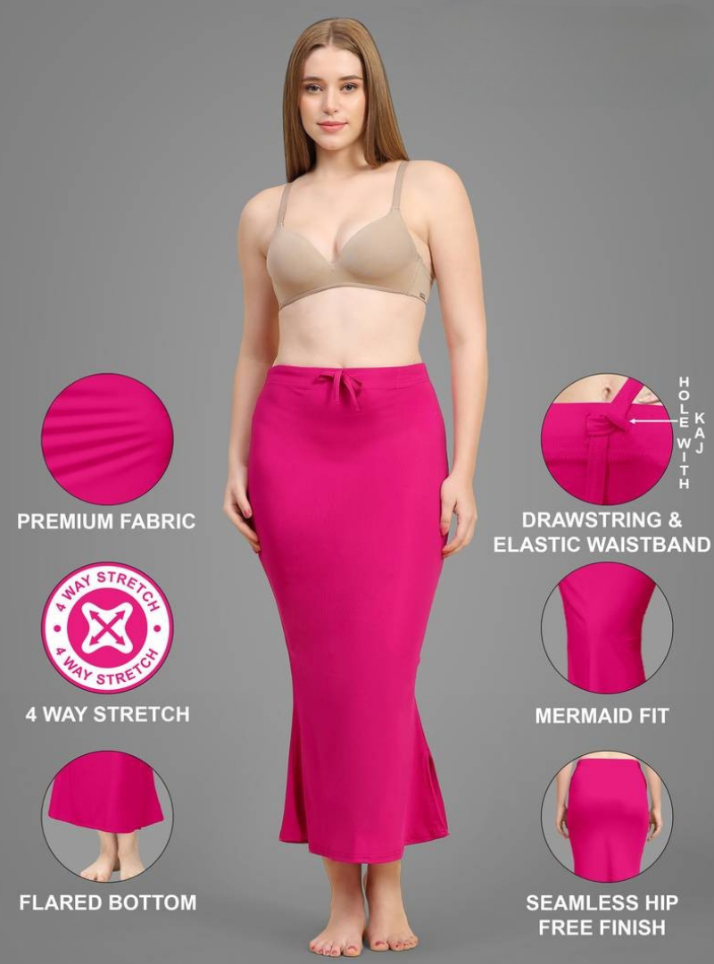 This shaping petticoat is crafted with polyamide spandex fabric that offers a soft feel and lightweight comfort for up to 12 hours. It features a strong elastic waistband that holds the saree weight and also has side slits for easy movement. Slip into this mermaid fit saree shaping petticoat, and show off well-defined curves under your favourite saree.
